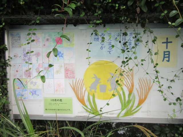 ビオトープ前に掲示板があるのをご存知でしょうか。その掲示板、ビオトープの緑に溶け込むかのように、周りが植物の緑で覆われています。まるで緑の額縁のようで、まさに「緑の掲示板」です。さてその掲示板ですが、今年度は月ごとに児童が描いたその月に見られる花の絵を飾っています。5月から始めた取り組みで、10月は4年2組の児童の皆さんが描きました。また掲示板にはTSS委員会だよりも掲示してます。月ごとに変わる「緑の掲示板」、学校へお越しの際は、ぜひご覧下さい。