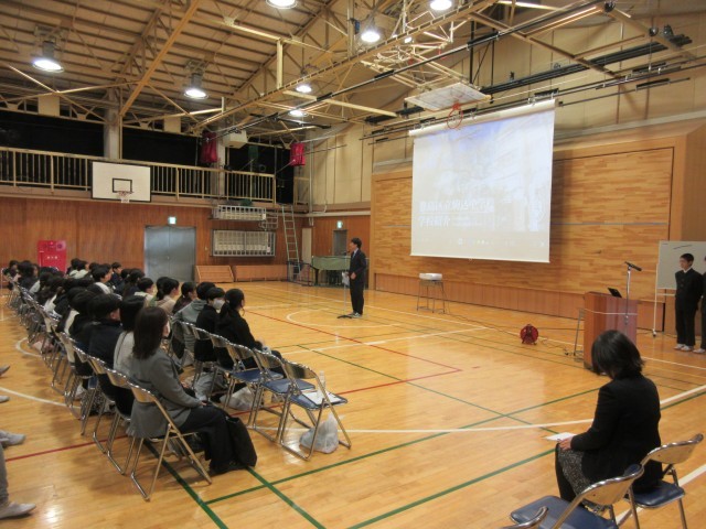 中学校の授業を体験した後、部活動の紹介動画を観て、校内めぐりをしました。