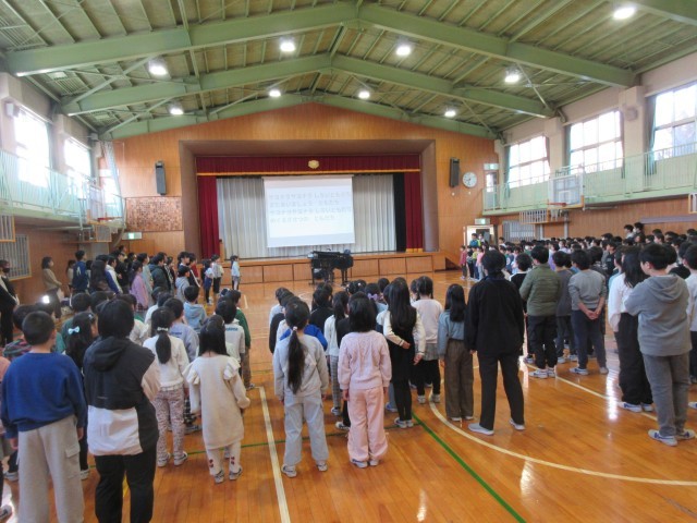 雪を楽しく表現する歌を全校で元気よく歌い、気持ちのよい朝となりました。