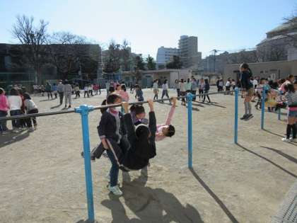 朝の寒さと打って変わって中休み(フリータイム)は、校庭に出ると日差しが暖かくなったと感じます。子供たちも鉄棒にぶら下がって楽しそうです。春がもうすぐそこまで来ているのでしょう。