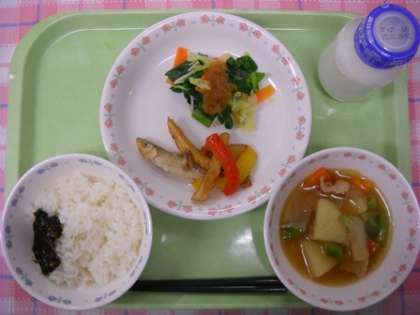 今日の給食にでているわかさぎは、今が旬の食材です。凍った湖に小さな穴を開け、釣り糸をたらして釣ることでも有名です。また、丸ごと食べることができるので、カルシウムをたくさんとることができます。