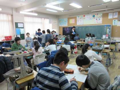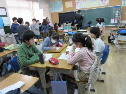 歌の練習の後、子供たちはそれぞれに分かれ、各先生方に「卒業文集への一言」を書いていただく依頼状を書きました。グループごとに協力し合う姿がありました。