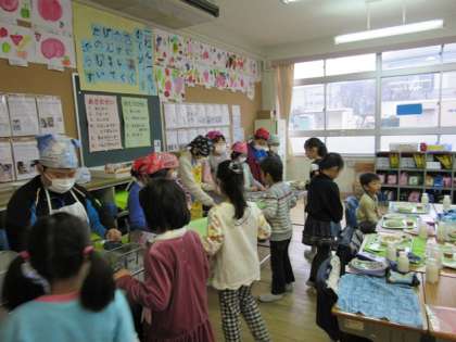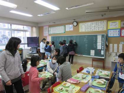 5年生がリーダーとなって初めてのなかよし給食が始まりました。今日は、6年生とのお別れ給食会の準備のために行われます。給食後、6年生と一緒に遊ぶゲームを決めます。そのための仕事分担も一緒に確認します。