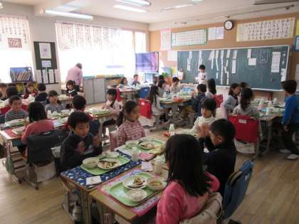 今日から学校給食週間です。給食が始まった明治時代にちなんで、今日はおにぎりと焼き魚のメニューです。1年生はおにぎりを手にもっておいしそうに食べています。おにぎりが大好きなんだね。