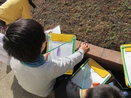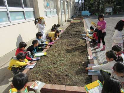 花壇の周りに1年生が集まっています。チューリップの芽がどのくらい大きくなっているでしょうか。観察した芽の様子を色鉛筆で書いています。「めという漢字を教えて」という子供もいました。まだ早いかな。