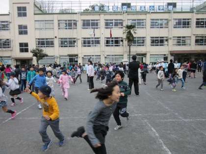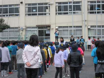 曇っている寒空の中、児童集会がありました。集会委員会の子供たちは、「宝さがし」の集会を行うために、校庭の隅々に40個の点数の書いた紙を隠しました。ルール説明の後
