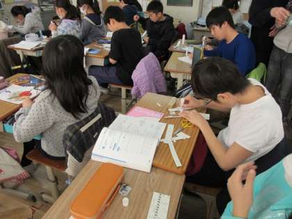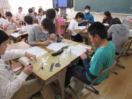 どの子供も夢中になって取り組んでいます。何を作っているのかなとのぞくと、計算尺を作っていました。細かいメモリを書き、はさみで工作用紙を切り、ノリを付け重ねて仕上げます。これを使って計算することを思い浮かべながら集中している6年生でした。