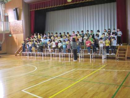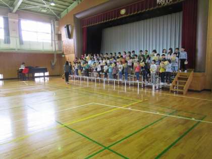 1年生は体育館に集まって、入学式後の歓迎の歌の練習をしています。本番は2年生として新1年生に「歓迎の歌」を披露します。どの子供も元気いっぱいに歌っています。きっとお兄さんお姉さんとして立派な姿を見せることでしょう。