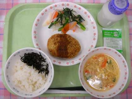 今日のコロッケは、給食室の手作りでした。仰高小のコロッケは、じゃがいもをふかして熱いうちにつぶし、肉ときざんだ野菜と大豆を混ぜてひとつずつ形を整え、衣をつけたら油でカラッと揚げて作ります。作るのにとても手間と時間のかかるコロッケですが、児童たちに喜んでもらえるよう、朝から給食室のみんなで心を込めて作りました。