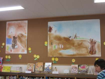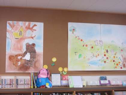 ゆめのくに図書館の1階フロアーは読書センター機能を備えています。その南側の壁は、物語の世界が描かれています。定期的に更新しています。このことでファンタジーの世界を創り出そうとしています。子供たちが楽しんで本を読む空間となっています。