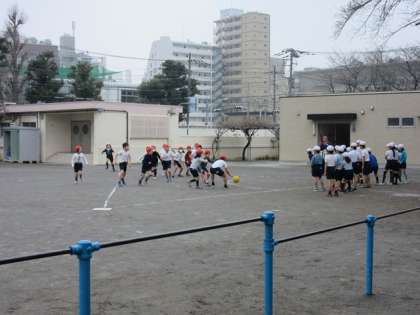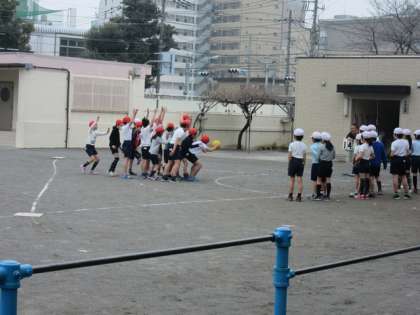 2組では全員参加の三角ベースをやっています。攻撃側がボールを蹴ったら、守備の子供たちはボールを取り同じポーズをとります。その間にベースまで走ればセーフ、ポーズが先ならアウトです。楽しいルールを考えています。子供たちは歓声をあげて試合をしていました。