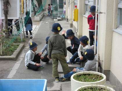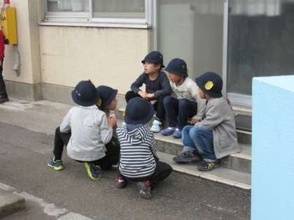 1年生の子供たちが職員室前の階段に腰を下ろし相談しています。何の相談でしょう?でもとても楽しそうです。遊びの相談かな。いつも仲良ししている子供たちです。