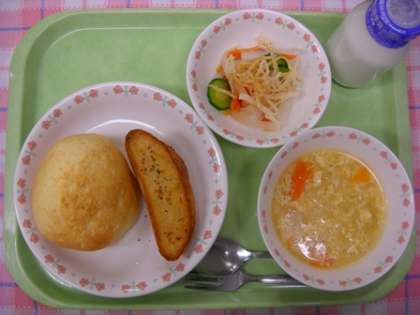 今日の給食は、昨日に引き続き大人気メニューの仰高メロンパンです。仰高メロンパンは、ふわふわのミルクパンにひとつひとつ手作業でクッキー生地をかぶせ、グラニュー糖をまぶしてオーブンで焼いて作ります。中はふんわり、外はサクサクの仰高メロンパンは、『毎日仰高メロンパンが食べたいです!』という児童もいるほど人気があります。また、ガーリックトーストとかみかみサラダも人気のメニューなので、今日は児童たちもみんな大喜びでした。