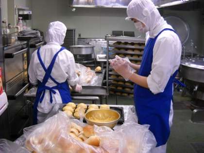写真は、仰高メロンパンにクッキー生地をかぶせているところです。