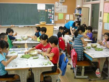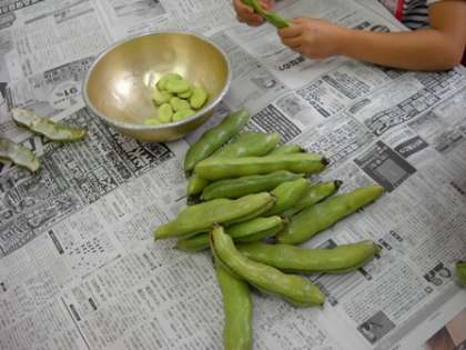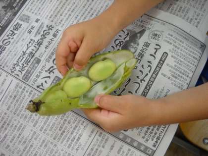 1年生が生活科でそら豆のさやむきをしました。「さやの中は、ふわふわになっているね!」「においもするよ!」など、たくさんの発見をすることができました。きれいにむいたそら豆は、給食のサラダとして全校生でおいしくいただきました。