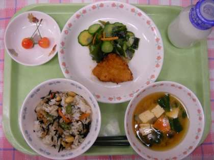 今日の給食のデザートは、旬のさくらんぼでした。さくらんぼは保存がきかないので、旬がはっきりしている果物です。4月頃に白い花を咲かせ、6月から7月にかけて小さな赤い実をつけます。また、今日の献立は全メニューが新しく給食に登場したメニューでした。カジキマグロの揚げ煮は、特に児童たちに人気だったようでした。