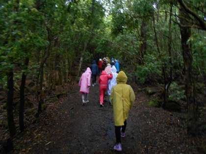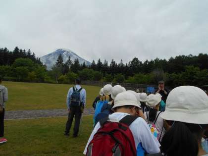 青木ケ原樹海に到着した時は雨が降っていました。そのため子供たちはカッパを着て、樹海を風穴までハイキングしました。午後のレーダードーム館見学後雨が止み、富士山が姿を現しました。
