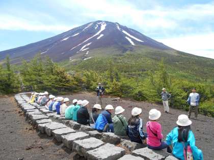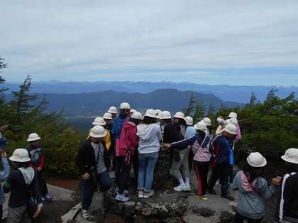 奥庭で子供たちは並んで座り、富士山を真近に見上げることができました。こんなに素晴らしい富士山を望むことは、めったにない体験と思いました。さらに先に進んで、南アルプスも遠くに見ることもできました。