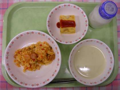 今日のスープに入っているグリンピースは、1年生がさやむきを手伝ってくれました。グリンピースはえんどう豆の未熟なもの、つまり成長途中のものです。今はグリンピースの旬で、1年でいちばんおいしく食べることができる時期です。いつもはグリンピースと聞いただけで残す児童が多くいますが、今日のポタージュはほとんどの児童が残さずに食べることができました