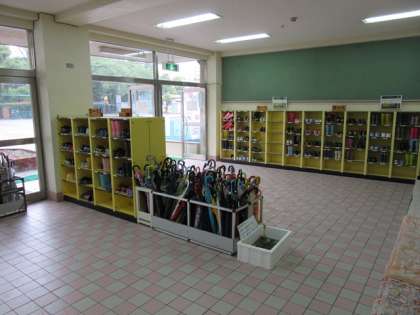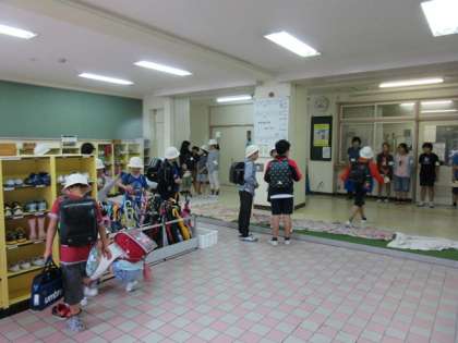 雨の朝を迎え、1年生が楽しみしていた校外学習が延期となりました。代表委員会のあいさつ運動も玄関の中で行いました。