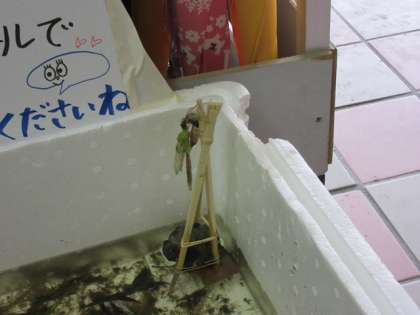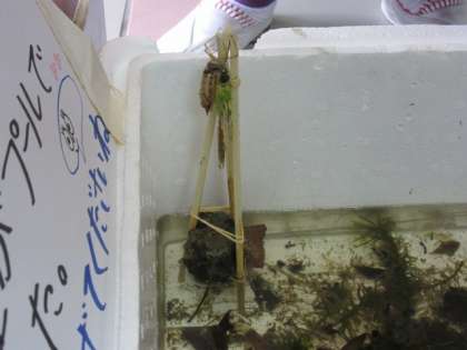 ヤゴが水の中から、割りばしで作った柱によじのぼり、殻を破り羽化しています。外に出て羽を乾かしています。子供たちが集まり歓声を上げていました。