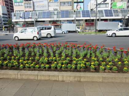 2年生の子供たちが植えた駅前花壇の赤、青、黄の花が、朝日に輝いています。地域の方に水やりのご協力をいただいています。子供たちの思いが道行く人に届くように見守っていきたいと思います。