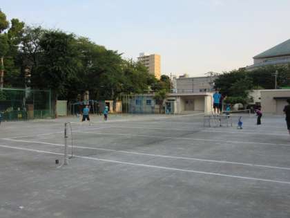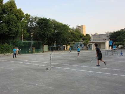 放課後、先生方のテニスの交流試合がありました。本校と千早小学校、目白小学校の3校が校庭で熱戦を行いました。
