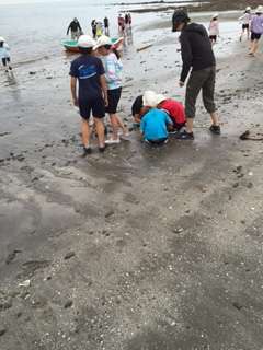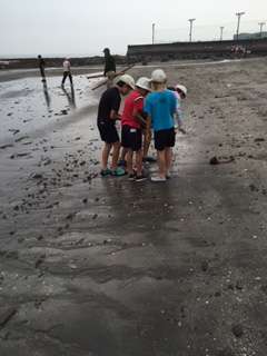 子供たちは、浜でカニを見つけ歓声を上げています。