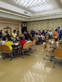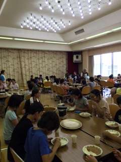 カレーライスの出来上がりです。飯ごうのご飯を分け、カレーをかけ、いただきます。