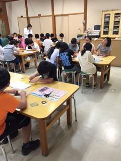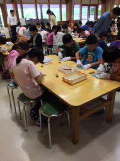 子供たちは、縄文時代にこの辺りから黒曜石が出土し、ここから日本全国に運ばれた話を聞きました。その後、黒曜石を加工し、ペンダントや勾玉、骨角器を作っています。