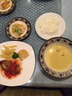 夕食は、コーンスープと鶏肉のソテー、サラダでした。とても美味しかったです。デザートも最高でした。