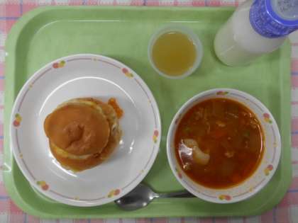 今日から1年生の給食が始まりました。今日は、人気メニューのグラタンパンでした。献立も、1年生が配膳しやすいように工夫しました。どちらのクラスも、初めての給食をうれしそうに食べていました。