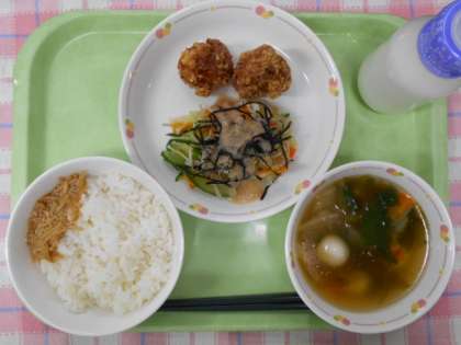 今日の給食のサラダは、梅ドレッシングのかかったサラダでした。6月から7月にかけてまとまって降る雨を、梅の雨と書いて「梅雨」といいます。ちょうど梅の実が熟す時期であることから、梅雨と呼ばれるようになりました。熟した梅を塩で漬けると梅干しになります。梅干しのすっぱい成分はクエン酸といって、からだの疲れをとってくれるはたらきがあります。