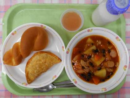 今日の給食は、夏にオリンピックが開催されるブラジルの料理風の献立でした。フェイジョアーダは、豆と肉を煮こんだ料理です。パステウは、小麦粉の生地にひき肉やチーズなどを包んで油で揚げたブラジルでも人気の料理で、給食ではぎょうざの皮を使って作りました。また、ブラジルは世界一のアセロラの産地なので、デザートはアセロラゼリーにしました。めったに食べる機会のないブラジル料理でしたが、パステウは児童たちに特に好評でした。