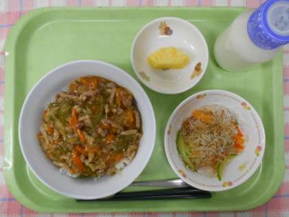 今日の給食のチンジャオロースどんぶりは、ごはんに中華料理のチンジャオロースをかけて食べました。「チンジャオ」はピーマン、「ロー」は肉、「スー」は糸のようなという意味で、ピーマンや肉を細く切って炒めた料理なので、チンジャオロースという名前になりました。今日は児童たちの好きなメニューばかりだったようで、みんなよく食べていました。