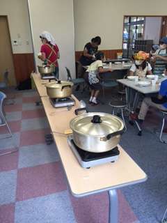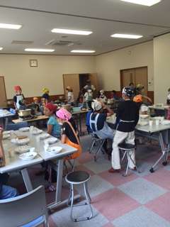 中ではカレー作りしています。鍋の具材が煮立っています。外のご飯と合わせることになります。