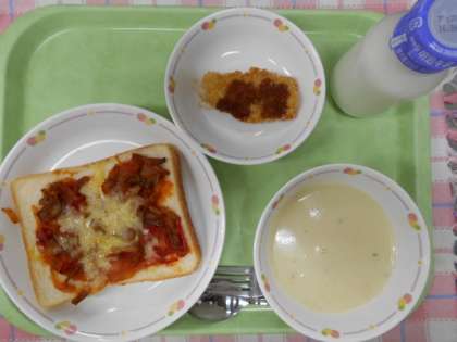今日の給食のピザトーストには、野菜がたっぷり入った給食室の特製トマトソースを使いました。トマトは、「トマトが赤くなると医者が青くなる」ということわざがあるくらい栄養があるので、児童たちにはしっかりと食べてもらいたい野菜です。
