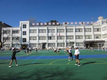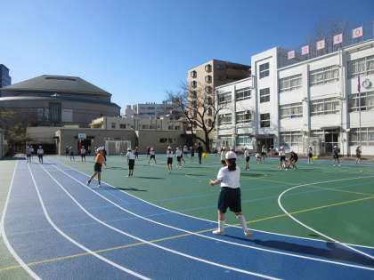 4年生は、ソフトボールを投げて受け取る練習をしています。キャッチボールの基本を学んでいます。