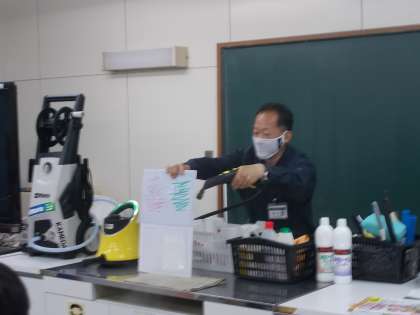 家庭科の「クリーン大作戦」では、学校主事の亀田さんをゲストにお迎えして、掃除の道具や工夫、コツなどを教わりました。高圧洗浄機などの本格的なものから、メラミンスポンジなどの身近な道具を紹介いただきました。また、洗剤の扱いやポイントを教えていただきました。