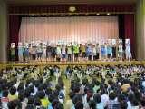 体育館で各委員会の紹介集会を開きました。冒頭に、代表委員会児童が児童会スローガン...