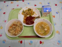 牛乳、ごはん、鶏肉のトマトソースかけ、カレーポテト、白菜スープ今日の献立は、6年...