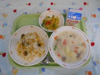 牛乳、コーンピラフ、パプリカサラダ、クリームシチュー