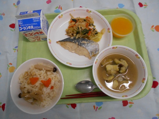 牛乳、炊き込みご飯、さわらの西京焼き、煮びたし、みそ汁、オレンジゼリー