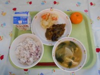 牛乳、ごはん、豚肉の香味焼、ジャーマンポテト、みそ汁、ミカン