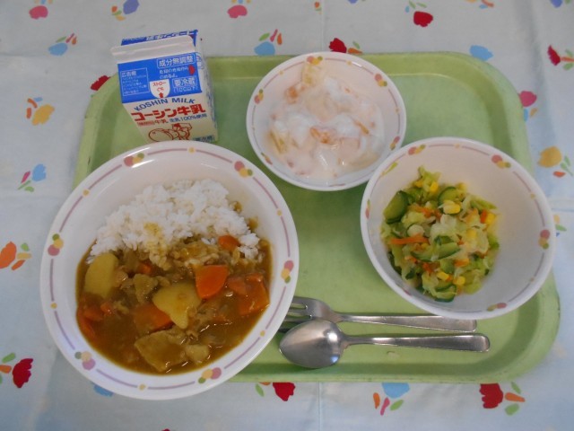 牛乳、ポークカレー、フレンチサラダ、フルーツヨーグルト