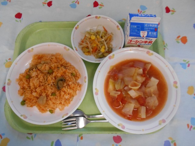 牛乳、チキンライス、青大豆入りサラダ、ミネストローネスープ