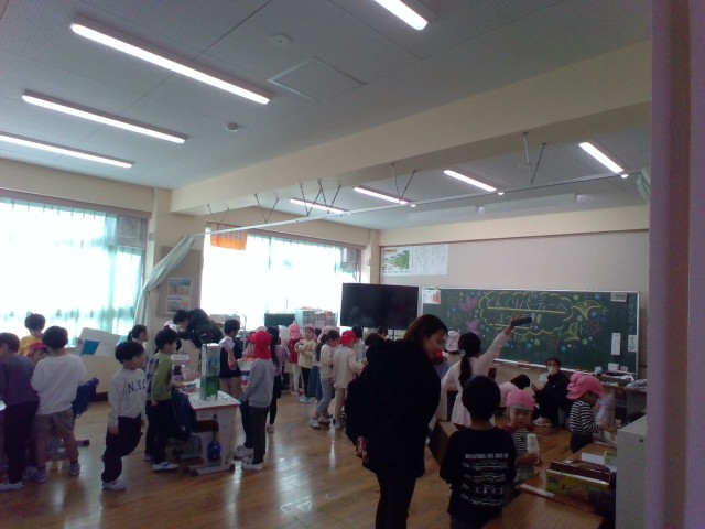 近隣の保育園・幼稚園の園児に来校してもらい、1年生の生活科授業で作成した「どんぐり」を使った作品で一緒に遊ぶなどして交流しました。1年生は作った作品で楽しく交流できたことにとても満足した様子でした。園児の皆さんは小学校生活に向けてワクワクの気持ちを高められたかな?