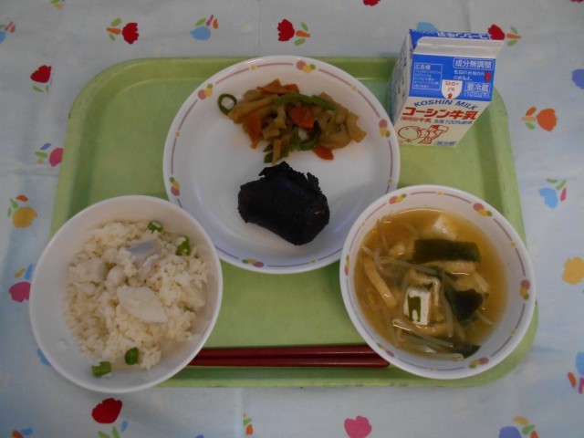 牛乳、里芋ごはん、イワシのさんが揚げ、レンコンのきんぴら、みそ汁