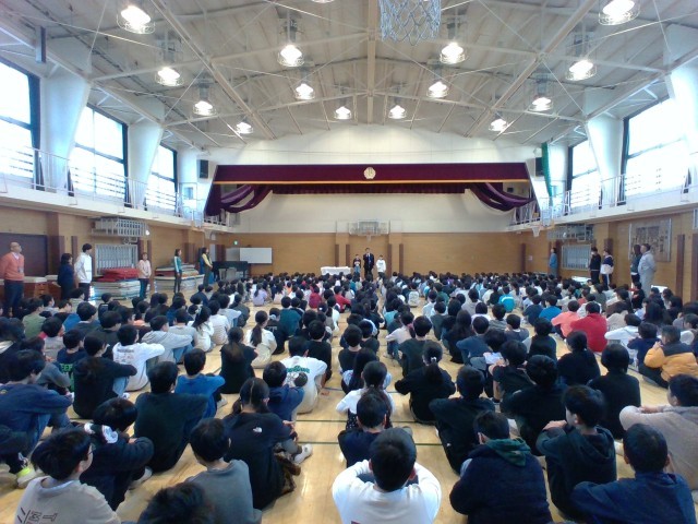 発表の後には、校長先生が、ドライヤーとビニール袋を用いて、簡易的な熱風船を作って「温かい空気は上に上がる」ということから、「暖房機器の使用時やお風呂などでも気付くことがあるかもしれませんね。」といった話をされました。熱風船が少し寒さある体育館の上方に上がって行く様子に児童は大興奮でした。