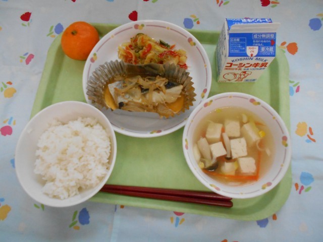 牛乳、ごはん、甘塩タラのポン酢かけ、ちりめんじゃこサラダ、豆腐とコーンのスープ、ミカン